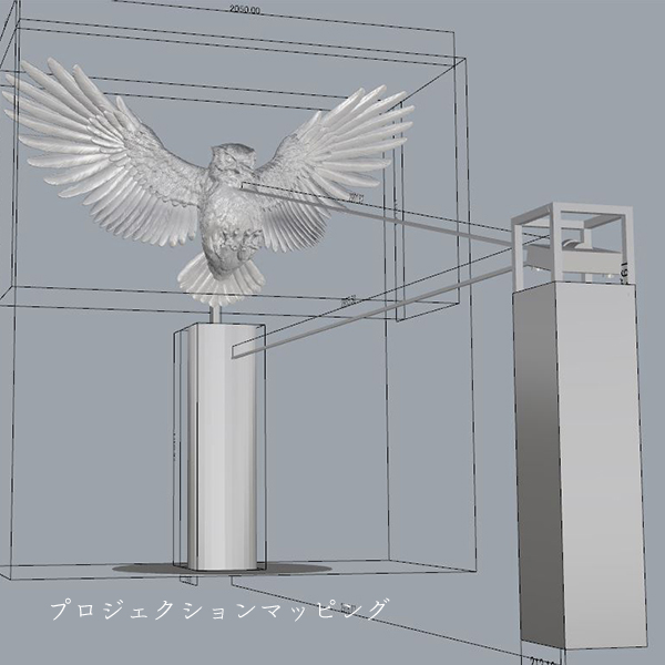 プロジェクションマッピング。白一色の大型フィギュアに、プロジェクターで映像を投影します。